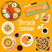 Kuchnia francuska restauracja wektor menu z serem i chlebem żywności, bagietki i rogalika. Zupa cebulowa, makaron spaghetti z czarnymi truflami, tosty pomidorowe i sałatka figowa, tradycyjne dania śniadaniowe