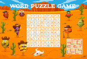Szukaj słowa gra logiczna. Kowboj z Dzikiego Zachodu, szeryf, bandyta i rabuś z witaminami. Słownictwo logiczne, krzyżówka wektor siatki arkusz roboczy z K, Cu, Ca i Mg, Cl, witaminy Zn osobistości