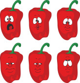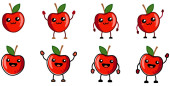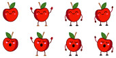 Cute kawaii stylu czerwony dzwon papryka warzyw ikona, oczy zamknięte, usta otwarte. Wersja z podniesionymi, opuszczonymi i machającymi rękami