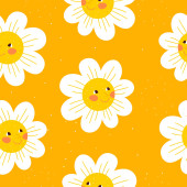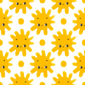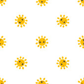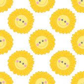 prosty bezszwowy wzór z zabawnymi żółtymi słońcami z twarzą. Cute dziecinna sztuka z słońcem na białym tle. Projekt i nadruk dziecka, projekt tkaniny, sztuka ścian, papryka owijająca