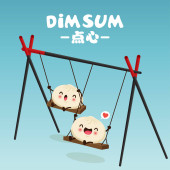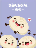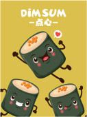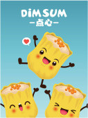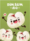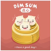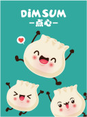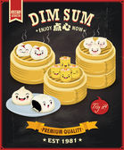 Projekt plakatu rocznika przekąski dim sum. Tekst chiński oznacza danie chińskie małe gotowane na parze lub smażone pikantne pierogi zawierające różne nadzienia, podawane jako przekąska lub danie główne.