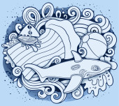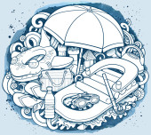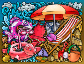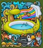 Kreskówka śmieszne słodkie bazgroły ręcznie rysowane lato plaża rozrywka dla dzieci okrągła ilustracja. Wiele obiektów rekreacyjnych kolorowe tło wektor.