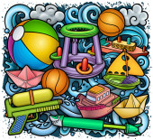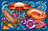 Zdjęcie "Kreskówka śmieszne słodkie bazgroły ręcznie rysowane lato plaża rozrywka dla dzieci okrągła ilustracja. Wiele obiektów rekreacyjnych kolorowe tło wektor." może być wykorzystywane do celów osobistych i komercyjnych zgodnie z warunkami zakupionej licencji Royalty-free. Obraz jest dostępny do pobrania w jakości wysokiej rozdzielczości do 5760x3840.