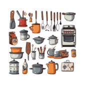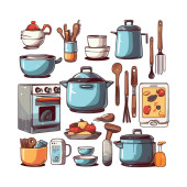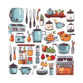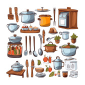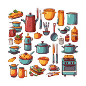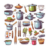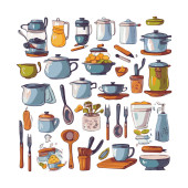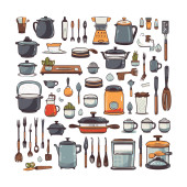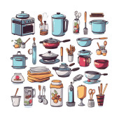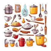 Kitchenware set graphic elements in flat design. Bundle of kettle, ladle, spoon, fork, frying pan, mug, board, bowl, knife, rolling pin, spatula and other utensil. Illustration isolated objects