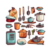 Zdjęcie "Kitchenware set graphic elements in flat design. Bundle of kettle, ladle, spoon, fork, frying pan, mug, board, bowl, knife, rolling pin, spatula and other utensil. Illustration isolated objects" może być wykorzystywane do celów osobistych i komercyjnych zgodnie z warunkami zakupionej licencji Royalty-free. Obraz jest dostępny do pobrania w jakości wysokiej rozdzielczości do 5760x3840.