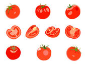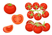 Zestaw czerwonych pomidorów izolowanych na białym tle. Realistyczna ilustracja 3D wektora. Całe, pół na pół, gałąź czerwonych pomidorów wiśniowych. Dojrzałe pomidory w czerwonym soczystym plusku. Świeże warzywa
