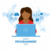 Ilustracja wektora Dnia Administracji Systemu. Kobieta admin za pomocą wektora ikony laptopa. Element projektu administratora systemu pracującej kobiety. Zestaw ikon programowych. Ważny dzień