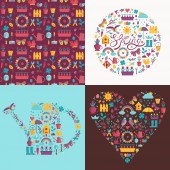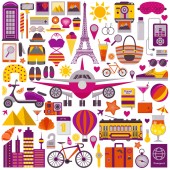Włochy kliparty podróży zestaw z kobieta jazda skuter i włoski chart w koszyku. Włoski vintage elementy kolekcji kultowych zabytków, tradycyjne jedzenie i popularne symbole kulturowe.