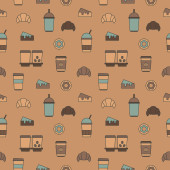 Płynny wzór filiżanek kawy, napojów, rogalików, ciast, pączków. Ilustracja na temat żywności, kawy i słodyczy. Wektorowe abstrakcyjne tło ikon filiżanek kawy, herbaty, deseru, pieczenia