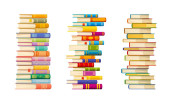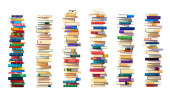 Wysokie stosy książek. Biblioteka uniwersytecka podręcznikowy stos, nauka nauczania, bestsellerów powieści kupa lub edukacja kreskówki wektor grupy książek. czytanie literatury szkolnej, wyodrębnione stosy słowników