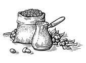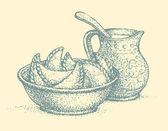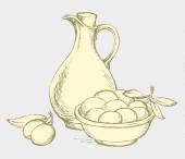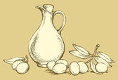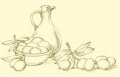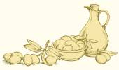 wektorowej. Martwa natura oleju w dzbanku i oliwki gałązki