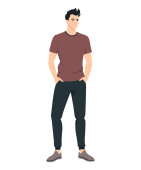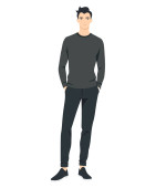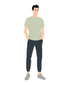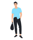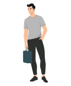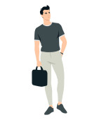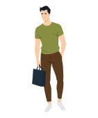 Młody mężczyzna w jasnych spodniach i zielona koszulka z czarną teczką..