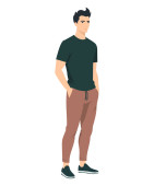 Młody człowiek łatwe spojrzenie z beżowym t-shirt i brązowe spodnie tworząc poczucie komfortu i stylu.