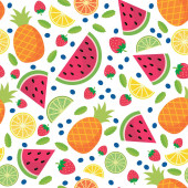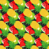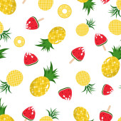 Wzór z żółtych bananów, ananasów i soczyste truskawki.