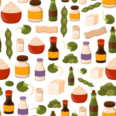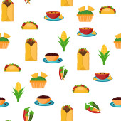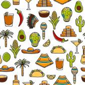 Seamless background with cute cartoon hand drawn objects on mexican food theme: chili, taco. tobacco, birrito, nachos, tequila, rice. Travel mexicam cuisine concept, You can use it for your site, app