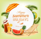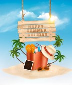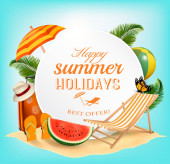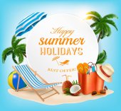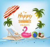 Tło wakacje. Plaża z palmami i błękitne morze. Wektor.