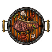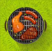 Grill latem z nogi kurczaka, kiełbasa i wołowina stek grillowania, Płaska konstrukcja