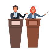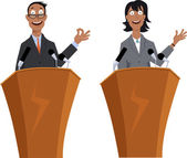Bizneswoman i biznesmen mówiąc z głośników stoją na białym tle