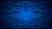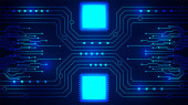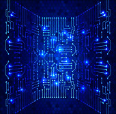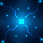 Futurystyczny świecący układ scalony z mikrochipem AI na ciemnoniebieskim tle. Sztuczna inteligencja, cyberbezpieczeństwo i koncepcja technologii cyfrowych. Abstrakcyjna ilustracja wektora.