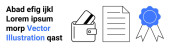 Ikony biznesowe, w tym kalendarz ze znakami kontrolnymi, portfel z kartami i fabryka. Idealny do planowania, zarządzania finansami, wglądu w branżę, wydajności, planowania, organizacji