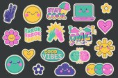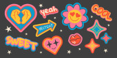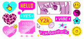 Naklejki na piksel Y2k są izolowane na czarnym tle. Ilustracja wektorowa uśmiechniętych emotikonów, kaset telewizyjnych i kasetowych, CD, strzałek, ikon serca, paska ładunkowego, zajebistych emotikonów do retro social media design