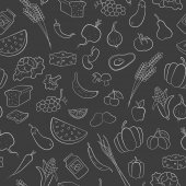 Seamless background with objects in hand drawn outline style on paleo diet theme: meat, fish, fruits, vegetables, spices, nuts. Healthy food concept