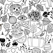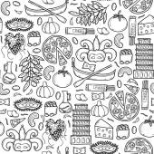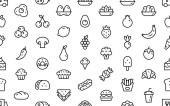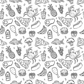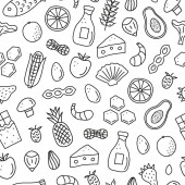 Seamless background with products prohibited during paleo diet in hand drawn cartoon outline style: corn, cake, rice, carrot, bread, bean, sugar. Healthy food concept