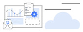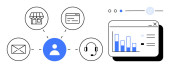 Centralna ikona użytkownika podłączona do poczty e-mail, sklepu, strony internetowej i ikon zestawu słuchawkowego, obok rosnącego wykresu słupkowego. Idealny dla biznesu, marketingu, komunikacji, strategii wzrostu analityka proste lądowanie