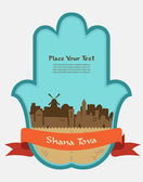 Pozdrowienie projekt karty żydowski nowy rok wakacje z tekstem szczęśliwego nowego roku w języku angielskim i hebrajskim. Ilustracja wektorowa