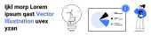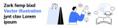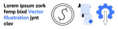 Abstrakcyjna sztuka liniowa z dynamicznym designem po lewej i osoba w słuchawkach otoczona nutami muzycznymi i pomysłami twórczymi po prawej stronie. Idealny do muzyki, kreatywności, inspiracji, designu, abstrakcji