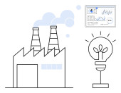 Fabryka przemysłowa emitująca dym obok turbiny wiatrowej i karty zaangażowania mediów społecznościowych. Idealny dla zrównoważonego rozwoju, zielonej energii, świadomości ekologicznej, wpływu na środowisko, czystych technologii, korporacyjnych