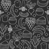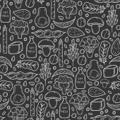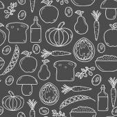 Seamless background with objects in hand drawn outline style on paleo diet theme: meat, fish, fruits, vegetables, spices, nuts. Healthy food concept