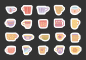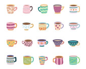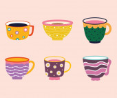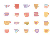Kubek drinkisą ustawione w stylu skandynawskim do kuchni i śniadania z ceramicznych zastaw stołowych na herbatę, kawę i gorący napój dla ilustracji i kreatywnych projektów