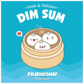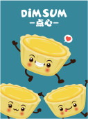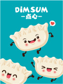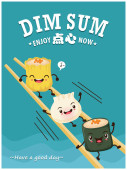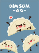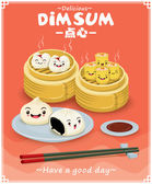 Projekt plakatu rocznika przekąski dim sum. Tekst chiński oznacza danie chińskie małe gotowane na parze lub smażone pikantne pierogi zawierające różne nadzienia, podawane jako przekąska lub danie główne.