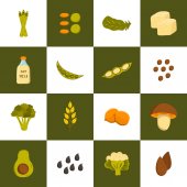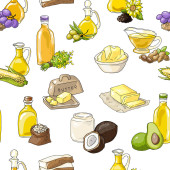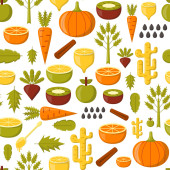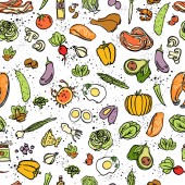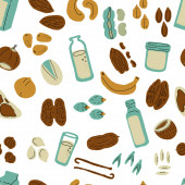 Bezszwowe tło z kreskówki ręcznie rysowane obiekty na wegańskie tematu źródła białka: tofy, soi i mleka, quinoa, soczewicy, chia. Zdrowe wegetariańskie jedzenie koncepcja