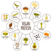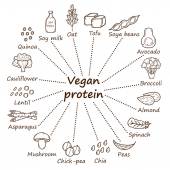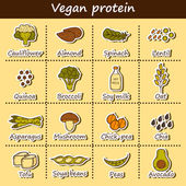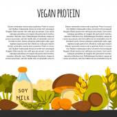 Komplet kreskówka ręcznie rysowane obiekty na wegańskie tematu źródła białka: tofy, soi i mleka, quinoa, soczewicy, chia. Zdrowe wegetariańskie jedzenie koncepcja