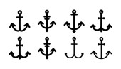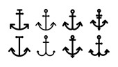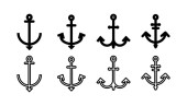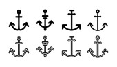 Vector zestaw monochromatycznych ikon kotwicy morskich w stylu sylwetki. Zawiera symbole żeglarskie, morskie sztuki dekoracyjne, elementy marynarki vintage ilustracje tematyczne oceanu