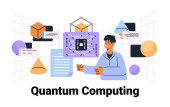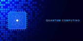 Koncepcja technologii kwantowej. Quantum qubit inteligentnych obliczeń. Technologia kwantowa. Analiza danych. Ręczne dotykanie interfejsu cyfrowego z połączonymi zębami i ikonami. Ilustracja wektora