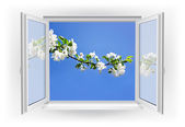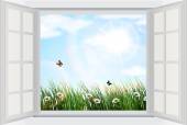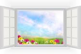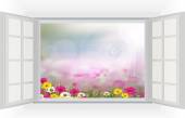 Otwórz okno z kwiatów tulipanów i liści w kolorach tęczy