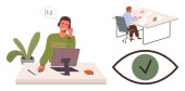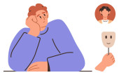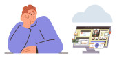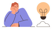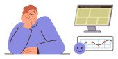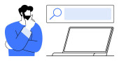 Młoda osoba odpoczywająca podbródek na rękę, rozważając rozwiązania, wzrost i postęp symbolizowane przez laptopa i strzałki w górę. Idealny dla biznesu, samorozwoju, edukacji, technologii, kariery innowacyjnej
