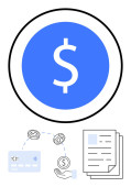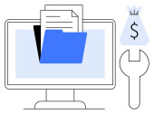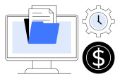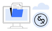 Przechowywanie plików, płatności online, zarządzanie cyfrowe, organizacja danych, usługi w chmurze, transakcje finansowe. Monitor z cyfrowym folderem i symbolem dolara w pobliżu ikony użytkownika. Przechowywanie plików