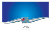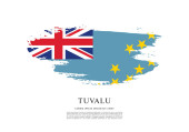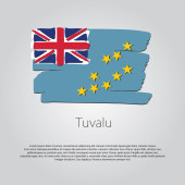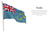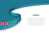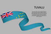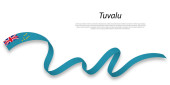 Flaga Tuvalu. Kultura Tuvaluana i Mikronezji. Ustaw na czystym białym tle z nazwą kraju i miejsca do kopiowania. Lśniąca flaga wektorowa przedstawiana w trzech warstwach tworzących dynamiczny efekt falowania z realistycznymi cieniami i gradientami