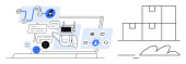 Sztuczna inteligencja, obsługa klienta, zakupy online, chatboty, e-commerce, cyfrowy przepływ pracy. Robot chatbot współpracuje z użytkownikami podczas gdy ikona koszyka s e-commerce. Czaty sztucznej inteligencji i handel elektroniczny