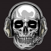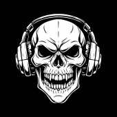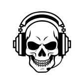 Ilustracja czaszki gracza z zestawem słuchawkowym i kontrolerem, czarne i białe logo gier