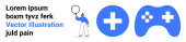 Chirurgia robotyczna, komunikacja online, gry, technologia sztucznej inteligencji, futurystyczne urządzenia, interfejsy cyfrowe. Robotyczne ramię wykonujące operację, kontroler gry na czacie. Chirurgia robotyczna i online