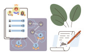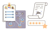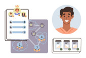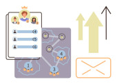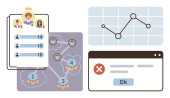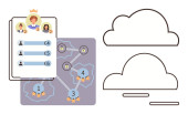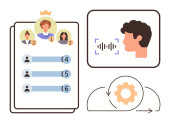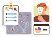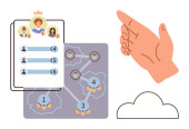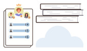 Gamifikacja, portale społecznościowe, zarządzanie zespołem, chmura obliczeniowa, rankingi, ochrona danych. Profile użytkowników z rankingami, sieć danych z zablokowanymi węzłami uśmiechnięty człowiek i chmura. Gamifikacja