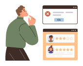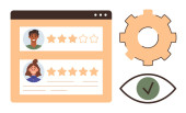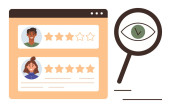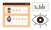 Recenzje online, systemy informacji zwrotnej, oceny użytkowników, ocena cyfrowa, wgląd klienta, oceny jakości. Duża ikona oka obok opinii użytkowników na stronie internetowej. Przeglądy online i systemy informacji zwrotnej