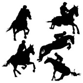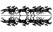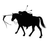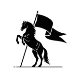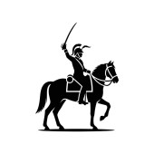 Dynamiczne czarne sylwetki wielu jeźdźców z włóczniami w potężnym ładunku, przedstawiające historyczną wojnę lub wyścig.