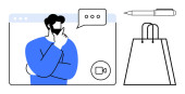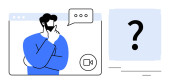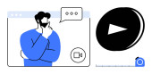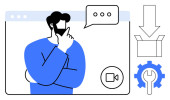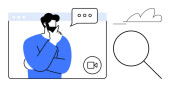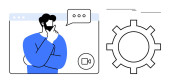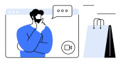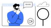 Człowiek rozważa podczas wirtualnego spotkania, bańki mowy, ikony wideo i reprezentacji waluty. Idealny do finansowania, podejmowania decyzji, konferencji internetowych, e-commerce, strategii biznesowej nowoczesny