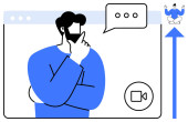 Zdjęcie "Człowiek rozważa podczas wirtualnego spotkania, bańki mowy, ikony wideo i reprezentacji waluty. Idealny do finansowania, podejmowania decyzji, konferencji internetowych, e-commerce, strategii biznesowej nowoczesny" może być wykorzystywane do celów osobistych i komercyjnych zgodnie z warunkami zakupionej licencji Royalty-free. Obraz jest dostępny do pobrania w jakości wysokiej rozdzielczości do 5760x3840.